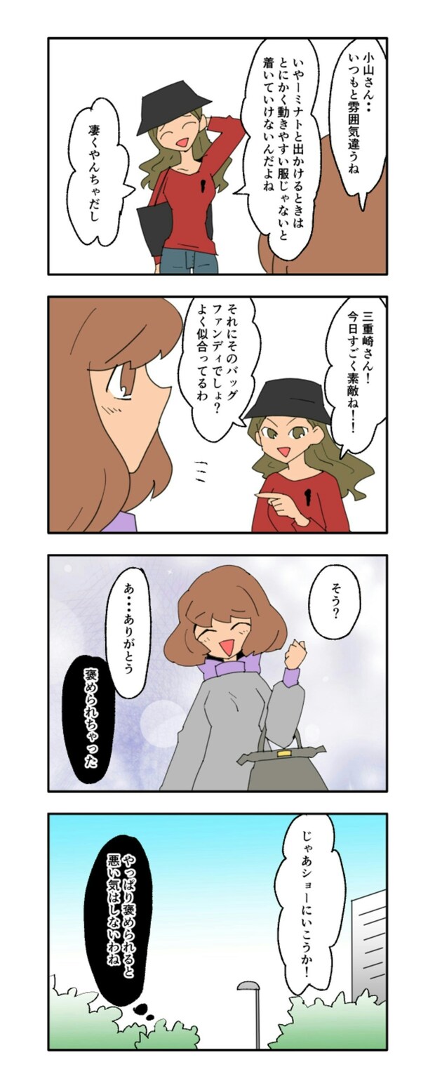 ハルミは、小山さんがいつもよりラフな服装で現れたのを見て、少し拍子抜けしました。しかし、その後で小山さんにブランドのバッグを褒められたため、すっかり機嫌が良くなりました。