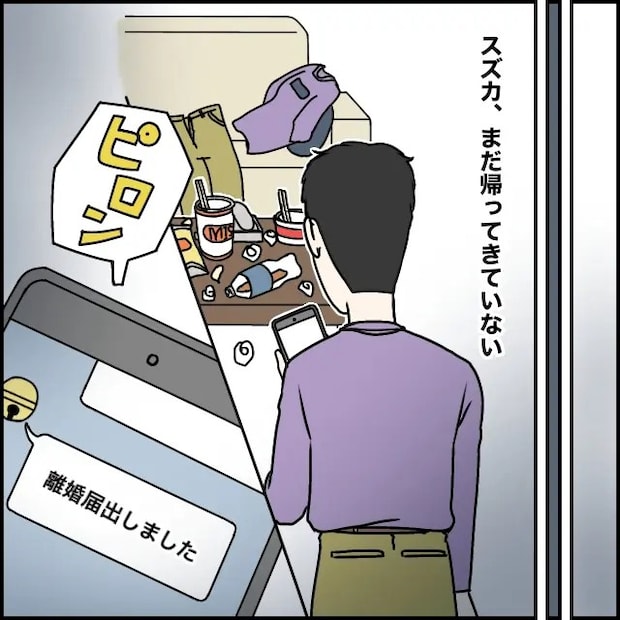 そして、家に戻ると、スズカさんはまだ戻っておらず、片づけていない散らかった部屋のまま。タカシさんが立ち尽くしていると、「離婚届出しました」とスズカさんからメッセージが届きました。