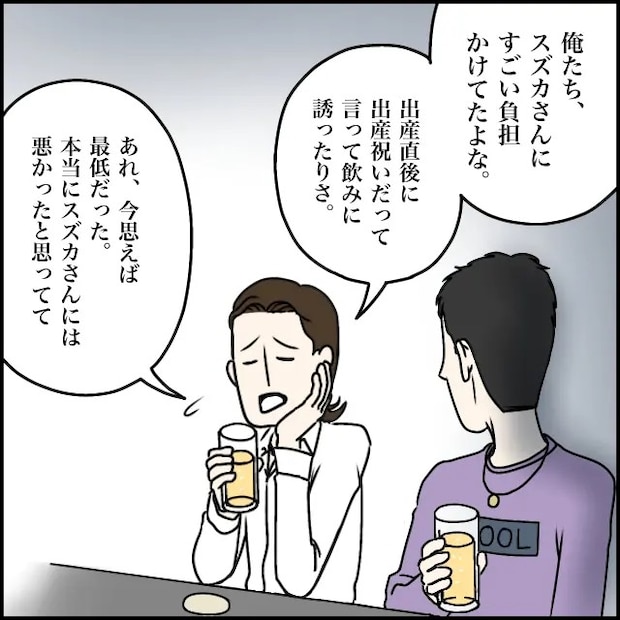 そして、「俺たち、スズカさんにすごい負担かけてたよな。出産直後に出産祝いだって言って飲みに誘ったりさ。あれ、今思えば最低だった。本当にスズカさんには悪かったと思ってて」と反省するアツヤさんの言葉に、