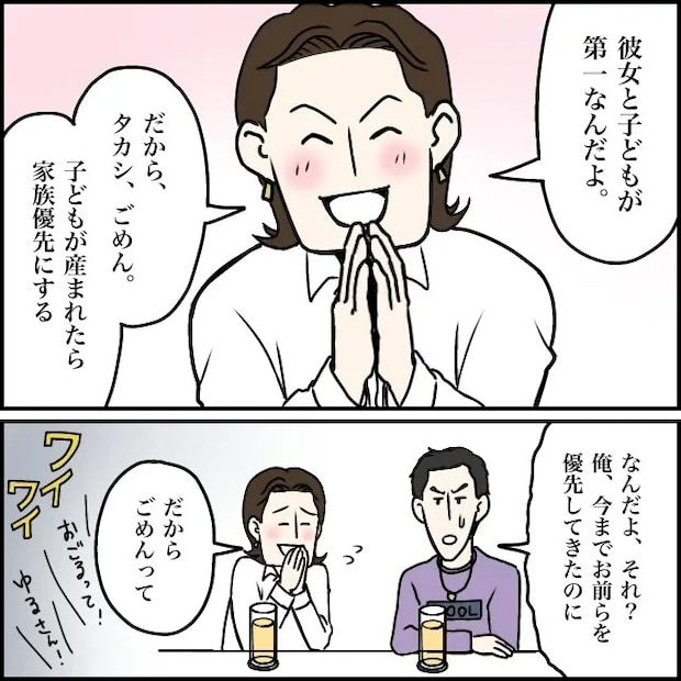 「彼女と子どもが第一なんだよ。だから、タカシ、ごめん。子どもが産まれたら家族優先にする」と手を合わせてそう話すアツヤさんに、「なんだよ、それ?俺、今までお前らを優先してきたのに」とタカシさんが文句を言うも、「だからごめんって。おごるって!」と結局押し切られてしまいました。