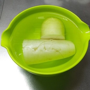 容器に水を入れて、大根をつけておきましょう。たったこれだけで、のちにシャキッとみずみずしい大根に大変身!