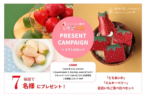 「いちご王国・栃木」コラボ小さいふ。の発売を記念して、栃木の名産いちご「とちあいか」と「ミルキーベリー」の食べ比べセットが抽選で7名当たるキャンペーンを実施。