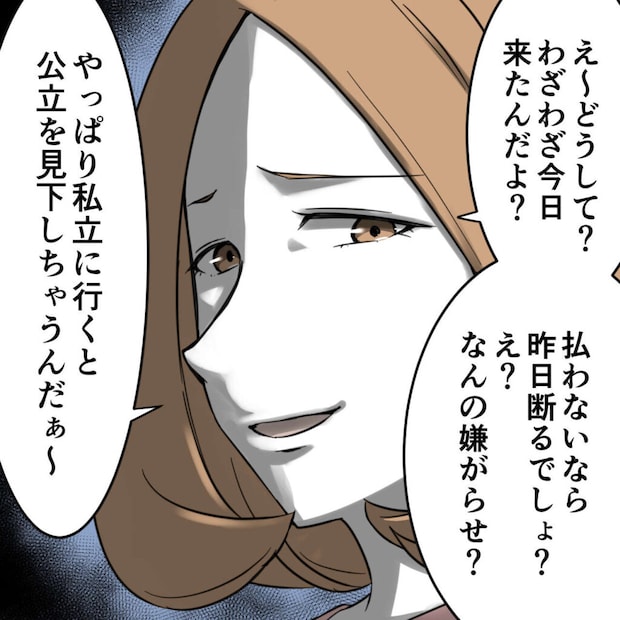するとニコニコしていたハルちゃんママの表情がガラリと変わりました。「どうして?わざわざ今日来たんだよ?払わないなら昨日断るでしょ?え?なんの嫌がらせ?」と嫌悪感をあらわにしたハルちゃんママは、「やっぱり私立に行くと公立を見下しちゃうんだぁ~」と嫌味たっぷりに言いました。ナミが私立中学に通っていることをハルちゃんママが知っている事にも驚きですが、公立を見下すなんて思ってもいなかったことを言われて驚きしかありませんでした。