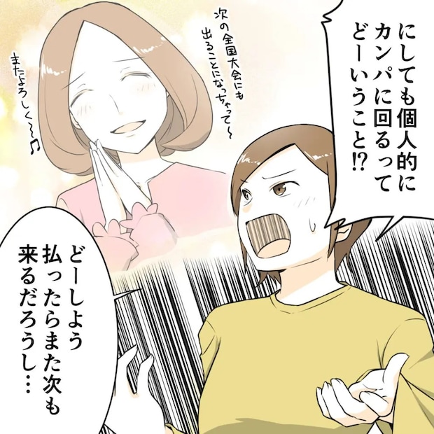 中学生の娘ナミちゃんと同じ年で、近所に住むハルちゃんが全国大会に出場することになったと言うことで、突然ハルちゃんママが訪問してきました。おめでとうと言ったものの、保育園が同じだっただけで、卒園してからは一度もお付き合いのないハルちゃんママ、しかも訪問理由が大会の応援に行くための1口1,000円の寄付金を個人的に集めに来たと言われて驚いたナミちゃんママです。やんわり断るも、ナミちゃんを私立中学に通わせているのでお金持ちでしょと強引に寄付をさせようと玄関先に居座るハルちゃんママに現金を持っていないと言うと、翌日もう一度集金に来ると言っていったん帰宅しました。数年ぶりにハルちゃんママと関わったナミちゃんママは、保育園時代からハルちゃんママの考え方が自分勝手でせこかったことを思い出し、疎遠になっていた理由もガソリン代を節約したいハルちゃんママが習い事に乗せて行ってほしいと全く関係ないナミちゃんママの家に来た時に、ハッキリ断って怒らせたことだったと思い出したのでした。