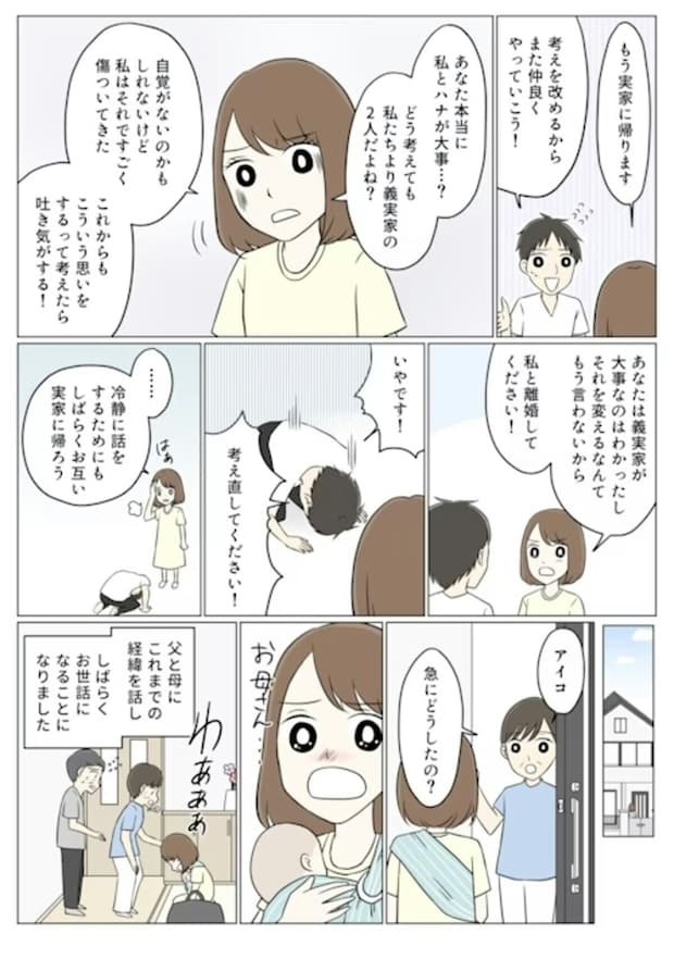 あれだけ夫婦で話し合い、両親にまで迷惑を掛けたのに、夫は全く変わっていませんでした。アイコさんは我慢の限界を迎え、実家に帰ることにしました。