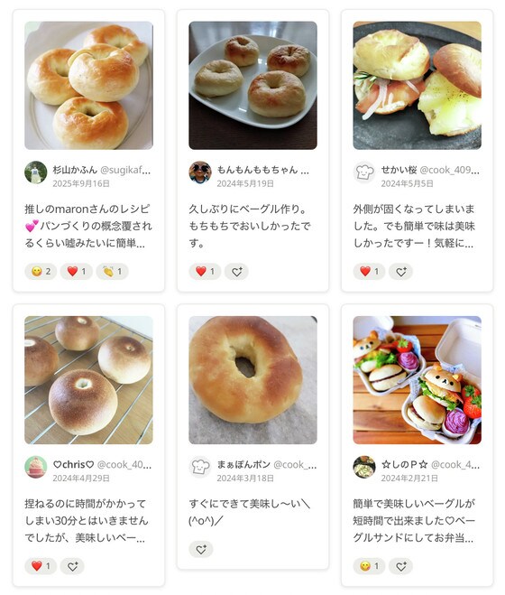 つくれぽ(つくりましたフォトレポートのこと)にも「もちもちでおいしかった」「すぐに作れて嬉しい」「短時間でベーグルが作れた」などの嬉しい声が届いています。
