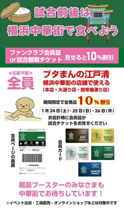 また、「試合前後は横浜中華街で食べよう」キャンペーンも実施する。1月24日(土)〜26日(月)に横浜中華街にある「江戸清」中華街本店・大通り店・関帝廟通り店にて、会計時に「試合観戦チケット」または「横浜エクセレンス会員証」を見せると、その場で10%割引される。