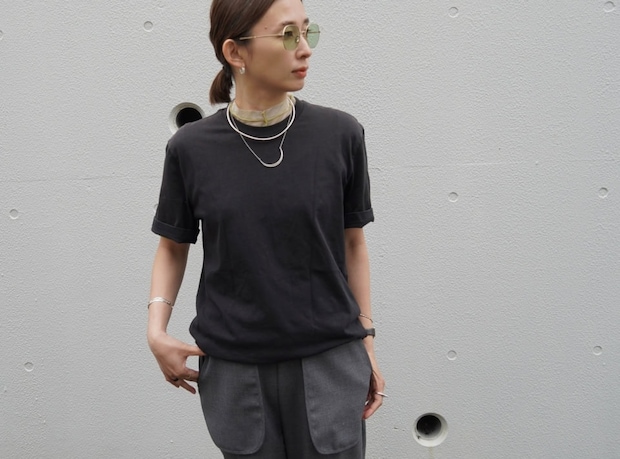 「シンプルになりがちな無地Tシャツとスラックスのワンツーコーデは、Tシャツの中にイエローのシアートップスをレイヤードして、モノトーンスタイルにさり気なくニュアンスをプラス。ジュエリーやサングラスなどソリッドな質感の小物使いでアクセントにしました」