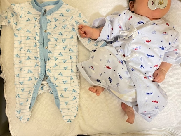左がドイツのもので、右が日本のもの。日本はボタンが少なく脱ぎ着がしやすいので、おむつ替えが多い新生児にとっては、日本のものが使いやすいと感じました。