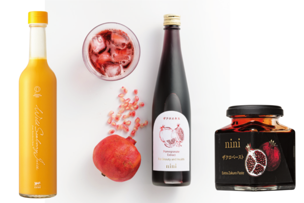 左から:200種以上の栄養素を誇るシーベリーのプレミアムなジュース。だいじょうぶなもの ワイルド シーベリージュース 500mL ¥4,104(たかくら新産業)、食べる美容液といわれる、ザクロの濃縮エキス。ニニ ザクロエキス 650g ¥5,940、最高品質のザクロを丸ごと絞って栄養たっぷり。ニニ ザクロペースト 200g ¥3,024(共にnini)