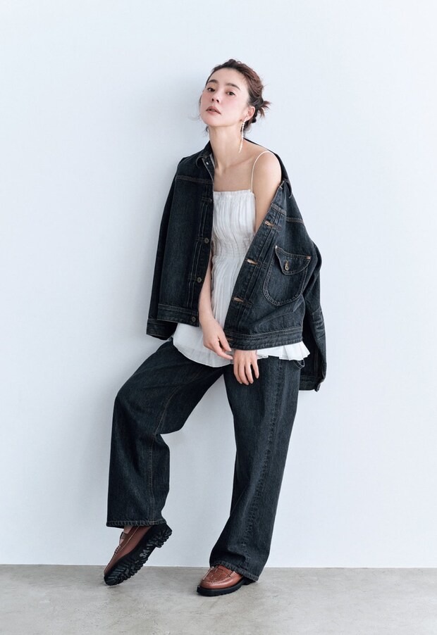 2023年春夏シーズンよりリブランディングし、現代女性を勇気づけるブランドへと生まれ変わったジル スチュアート。今シーズントレンドのブラックデニムを主役にしたスタイリングには、ソフトな生地のキャミソールを合わせてフェミニンな要素をプラス。
