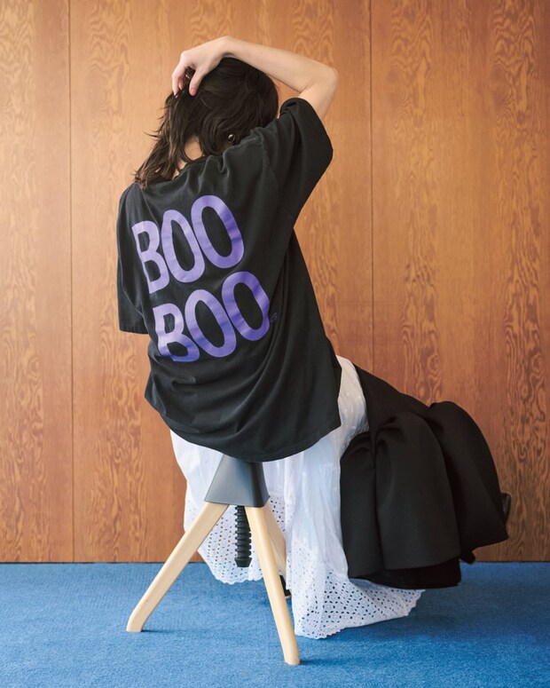 バックプリントでユーモアを。Tシャツ※メンズ[SIZE:XXL]¥7,800(Long Beach OMOTESANDO)、中に着たドレス¥127,600(マラン エトワール/イザベル マラン 青山店)、ジャケット¥68,200(パルマン)、イヤリング¥15,400(ケネス ジェイ レーン/シティショップ)、ロングブーツ¥88,000(カチム)