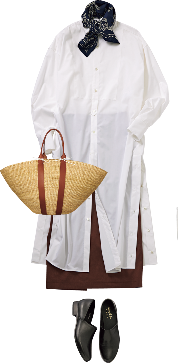 【DAY 20】シャツドレスの裾からテラコッタのスカートをチラリと覗かせて。襟元のバンダナが顔まわりを華やかに。