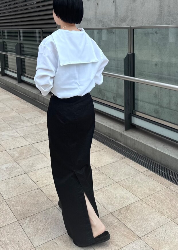 「スカートは前後に入ったスリットと、よく見ると一つしかないバックポケットがポイント。ミニマルなデザインなのにほんの少しひねりのあるデザインがお気に入りです」スカート¥28,600(エーピー ストゥディオ/AP STUDIO横浜店)