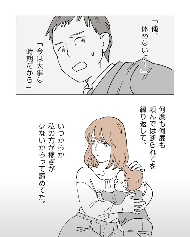 「急に言われても休めないよ」「今は大事な時期だから」良平に頼んでは断られてを繰り返して、いつからか私の方が稼ぎが少ないからと諦めるようになっていました。でも、心も体もすでに限界。母や同僚に迷惑をかけながら必死に働いても、育児も仕事も家事も全部中途半端にしかこなせていない自分。こんな状況でこのまま仕事を続けるのは無理かもしれない・・・そう考えていた矢先の事でした。