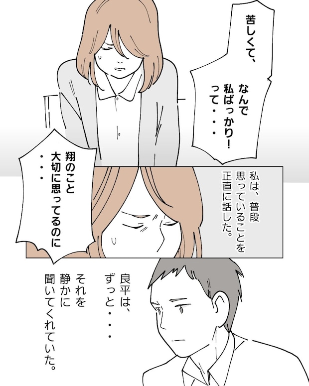 「苦しくて、なんで私ばっかりって、翔のこと大切に思ってるのに・・・」私は、胸に溜め込んできた本音をそのまま正直に伝えました。良平は言い訳も口を挟むこともせず、ただ静かに私の言葉に耳を傾けてくれました。