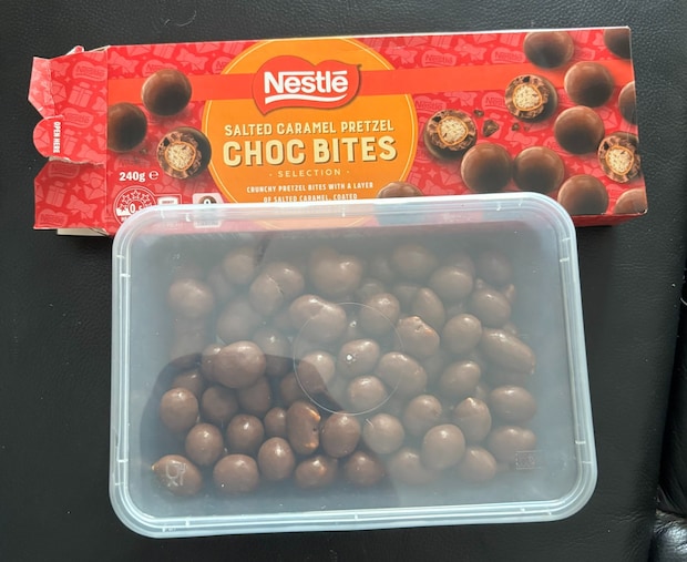 ところで、この一口サイズのチョコレートでコーティングされたつまめるおやつですが、中はサクサクした感じで、甘すぎずちょっとつまむのにちょうどいいおやつです。