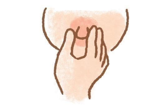 親指と人さし指、中指を乳輪にあて、指の腹で乳首を圧迫しておっぱいを出します。上下左右、斜め、あらゆる方向から偏りがないようにしぼるのがコツ。清潔な手で行い、つめを立てないように注意を。