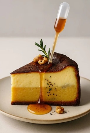 N4.5の「メープル香る安納芋とゴルゴンゾーラのチーズケーキ」は、ねっとりしたさつまいも生地×塩味のあるゴルゴンゾーラの組み合わせ。メープルをかけて味わう。
