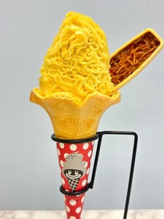 うなぎいもストアの「うなぎいも芋モンブランソフト」は、いものソフトクリームに濃厚な焼き芋ペーストを1mmで絞って、うなぎいもフロランタンと岩塩をトッピングしている。
