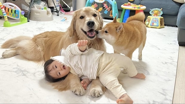 豆柴うに&ゴールデンレトリバーおから(@uni_okara0725)さんが投稿したある写真。わが子と愛犬が仲良くしている姿は、とても尊いですよね。そんな癒やしの写真をご紹介します。