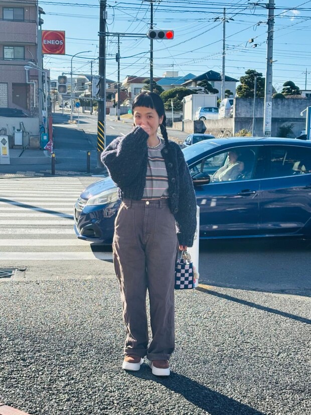 木津さんの愛息想太(そうた)君撮影。落ち着いたトーンのスタイリングに、ブラウンのスニーカーが見事にハマっています。こんなスタイリングなら真似できそうですよね?