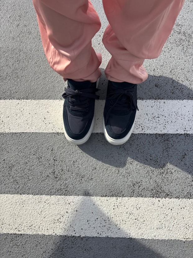 (新品ですので室内じゃん!という指摘はご容赦ください)カジュアルにまとめたいなら、こんな全身ピンクトーンにはくのも可愛い! 足元がキレイなので、いいバランスでまとまって見えます。