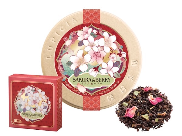 「サクラ&ベリー」は、桜の葉をブレンドした紅茶に苺の甘い香りをそえたもので、ミルクティーとしての利用もおすすめだ。