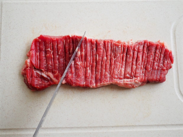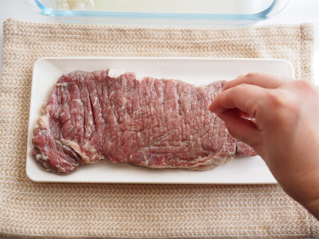 11. 9の牛肉に10を満遍なく乗せ、包丁の背を使って斜めに格子柄を入れる。