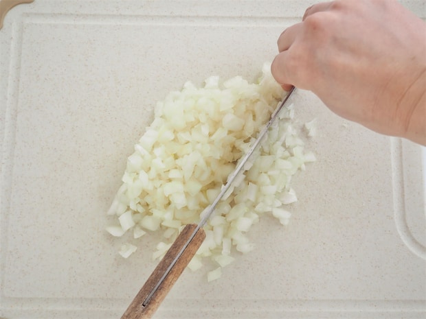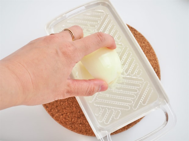 2. 残りの玉ねぎ1/2個をすりおろし、果肉と汁を分ける。