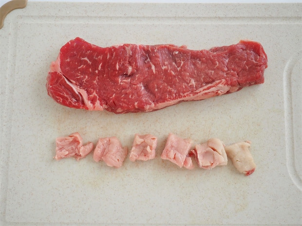 3. 牛肉の脂身を切り落とし、切り落とした脂身を角切りにする。