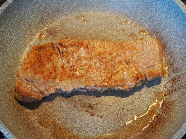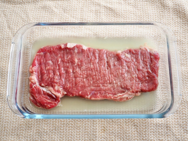牛ステーキ肉は、上等なものでなくていいそうです。今回は、スーパーにあった牛ロースのステーキ肉を使用。