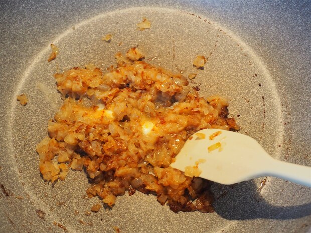 なんとなく弱火で調理。「キモめな色」になるまで炒めるそう。動画を見た感じ、飴色になるまで炒めるで大丈夫そう!(笑)