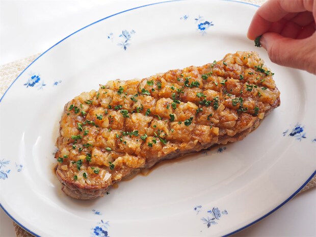 玉ねぎの甘みや旨味がじゅわっと広がって、肉の旨味をぐっと引き立ててくれる――そんな”旨味の爆弾”のようなステーキ。肉はとにかくやわらかく、バターの香ばしさが鼻から抜けるたびに食欲が加速。そこにふわっと香るパセリの爽やかさが加わって、味に立体感が生まれます。チーズのようなコクも感じられて、「こんなものが家で食べられるなんてうれしすぎ…!」としみじみ。本家レシピでは粗びき黒こしょうも使われているようだったので追加してみると、それがまた最高に合う!たっぷりめにかけるのが個人的にはおすすめです。