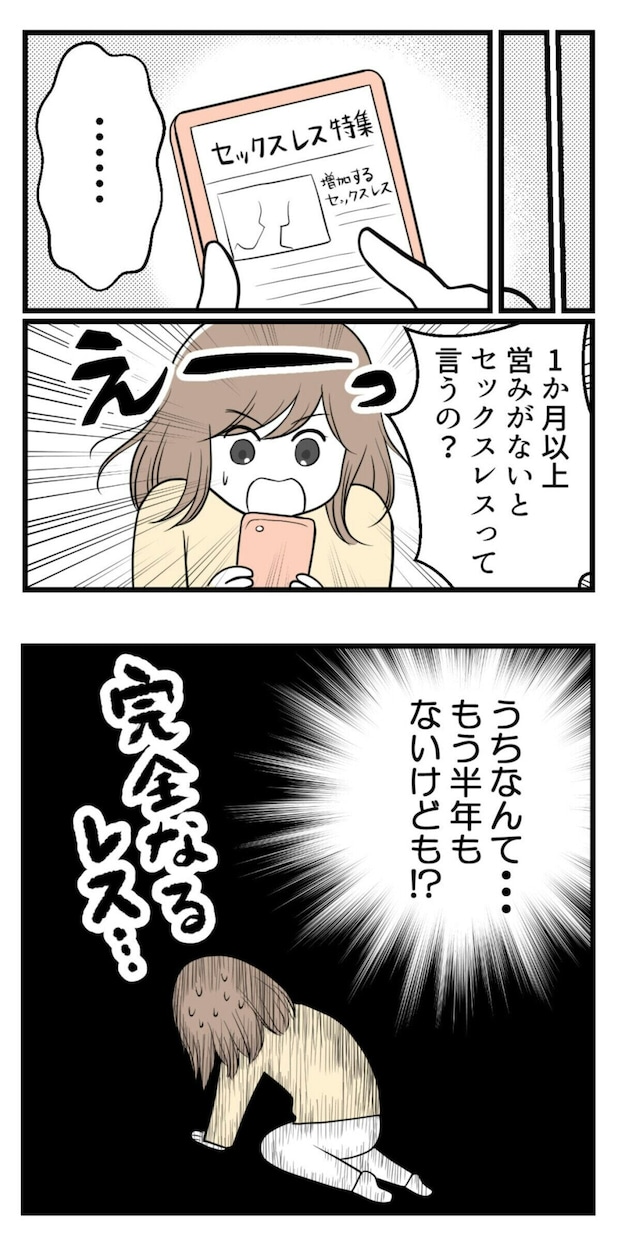 ある日、インターネットでセックスレスについて書かれたページを読んだ妻。自分たちは「セックスレス」だと知り、ショックを受けます。そして、このままではいけないと意を決して夫に話をしてみることにしたようです。
