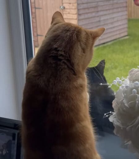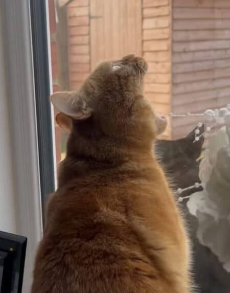 部屋の中からアピールをする茶トラさん。