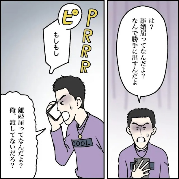 スズカさんからのメッセージを見たタカシさんは、「は?離婚届ってなんだよ?なんで勝手に出すんだよ」と怒り出しスズカさんに電話。「もしもし」スズカさんが電話に出ると、「離婚届ってなんだよ?俺、渡してないだろ?」とまくし立てました。