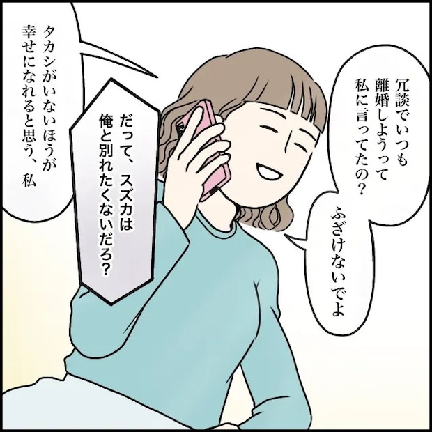「冗談でいつでも離婚しようって私に言ってたの?ふざけないでよ」スズカさんがそう言うと、「だって、スズカは俺と別れたくないだろ?」タカシさんの言葉に、「タカシがいないほうが幸せになれると思う、私」そう言って微笑むスズカさん。