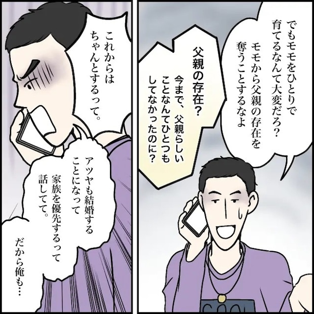 「でも、モモをひとりで育てるなんて大変だろ?モモから父親の存在を奪うことするなよ」タカシさんが必死にそう言うと、「父親の存在?今まで、父親らしいことなんてひとつもしてなかったのに?」とスズカさんに言われ、「これからはちゃんとするって。アツヤも結婚することになって、家族を優先するって話してて。だから俺も・・」とタカシさんは自分に言い聞かせるように話しました。