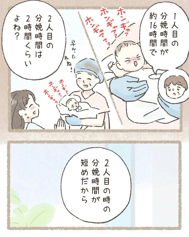 第三子となる三男を妊娠中のわこさん。お産を間近に控えたある日、助産師さんから、3人目の分娩時間は、第一子・第二子よりも早くなるかもしれないと告げられます。その場合の対処法を授けられますが、その時は「まさか」という気持ちで受け止めるにとどまります。