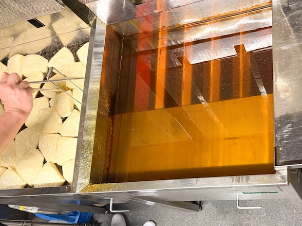 低温の油(左)と高温の油(右)で二度揚げすることで食べ応えのある食感に仕上げます。