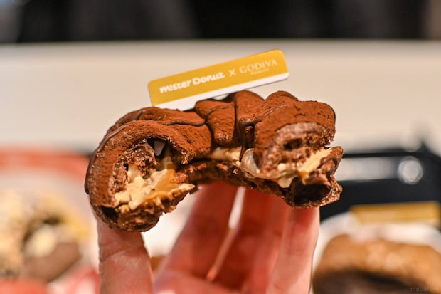 生ショコラフレンチ生地に、キャラメルクリームとプラリネホイップを挟み、チョコレートとココアパウダーで仕上げたドーナツ。