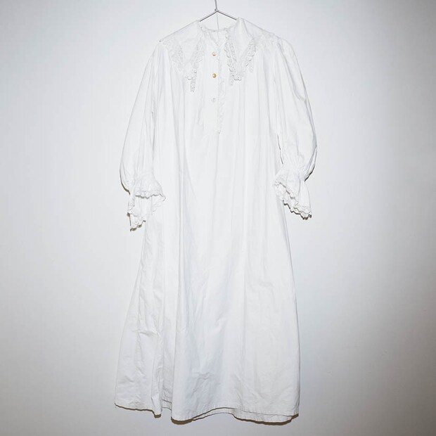 「オールドコットンの風合いが最高。黒のドレスや大きめのセーターを重ねて、襟や袖を見せる着方で♡ 最終的にはカットしてブラウスとスカートにしちゃう?と構想中」。トロ ヴィンテージ クロージングで購入したドレス/本人私物