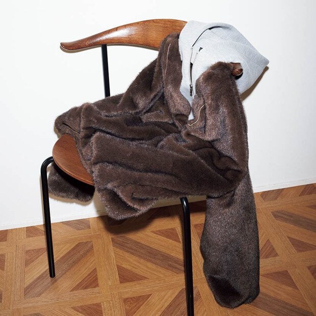 「一瞬、髪の毛!? と見まがう(笑)、毛足長めのビーニー。この絶妙な違和感がとにかく新鮮だし、被るとだらーんとなる無縫製ならではのフォルムもいいの」。イッセイ ミヤケのニットビーニー、 リング[中指]キウナ、[薬指]ブラミンク、[小指]スウェード/全て本人私物