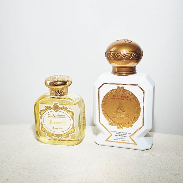「肌に優しくて香りも長もちする、BULYの水性香水『オー・トリプル』では温かみのあるハチミツ×ウッディな香りを。昔からずっと好きなサンタマリアでは、柑橘系のビッザリアが今年の気分でした」。左:サンタ・マリア・ノヴェッラのビッザリア、右:ビュリーのミエル・ダングルテール/共に本人私物