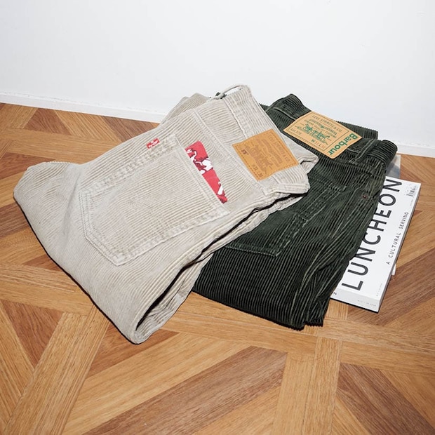 「古着、現行品問わず秋冬はヘビーユースなコーデュロイ。リーバイス®、多めです。大きめのメンズサイズをベルトでギュギュッと絞ってはくのが好き。ヒップポケットからはバンダナちらり♡」。リーバイス®のパンツ[グレー、カーキのBarbourコラボ]/共に本人私物