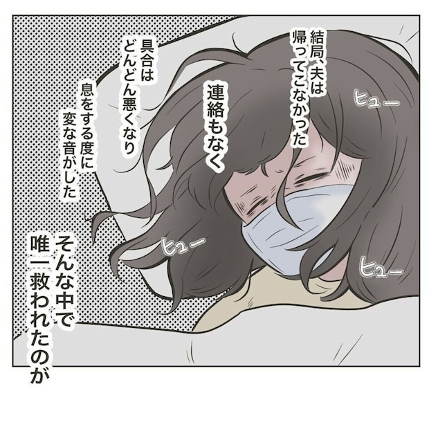 時間を追うごとに悪化していくフォロワーさんの体調が心配です。よっぽど根詰めていたのでしょう。夫は結局帰ってきてくれなかったといいます。そんな中、フォロワーさんの実母が助けにきてくれました。きっと、とてもホッとしたでしょうね。