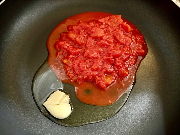 1. フライパンにオリーブオイル、つぶしたニンニク、トマト缶を入れて弱火で加熱する。