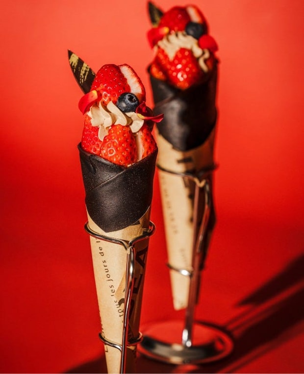 特別感あふれるスペシャリテには「いちごティラミスクレープ」を用意。ココアパウダーを練り込んだ黒色のクレープ生地に、いちごソースがしみ込んだスポンジを重ね、バニラたっぷりティラミスクリーム、フレッシュいちご、いちごのコンフィチュールを添えている。いちごをふんだんに使用した贅沢で華やかなクレープをぜひご賞味あれ。