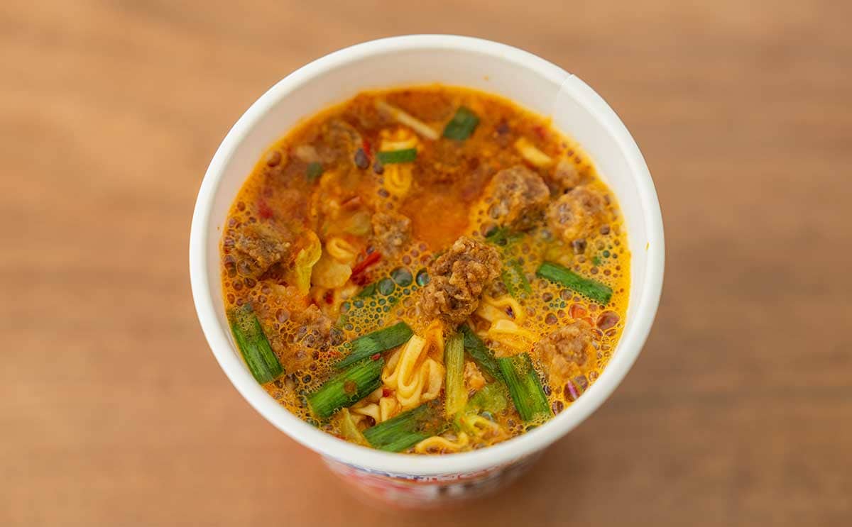 「カップヌードル 辛味噌」は、コクのある3種の味噌をベースに、肉と野菜の旨みを加え、豆板醤の風味と唐辛子の辛みをきかせた“旨辛”で濃厚なスープが特長です。
